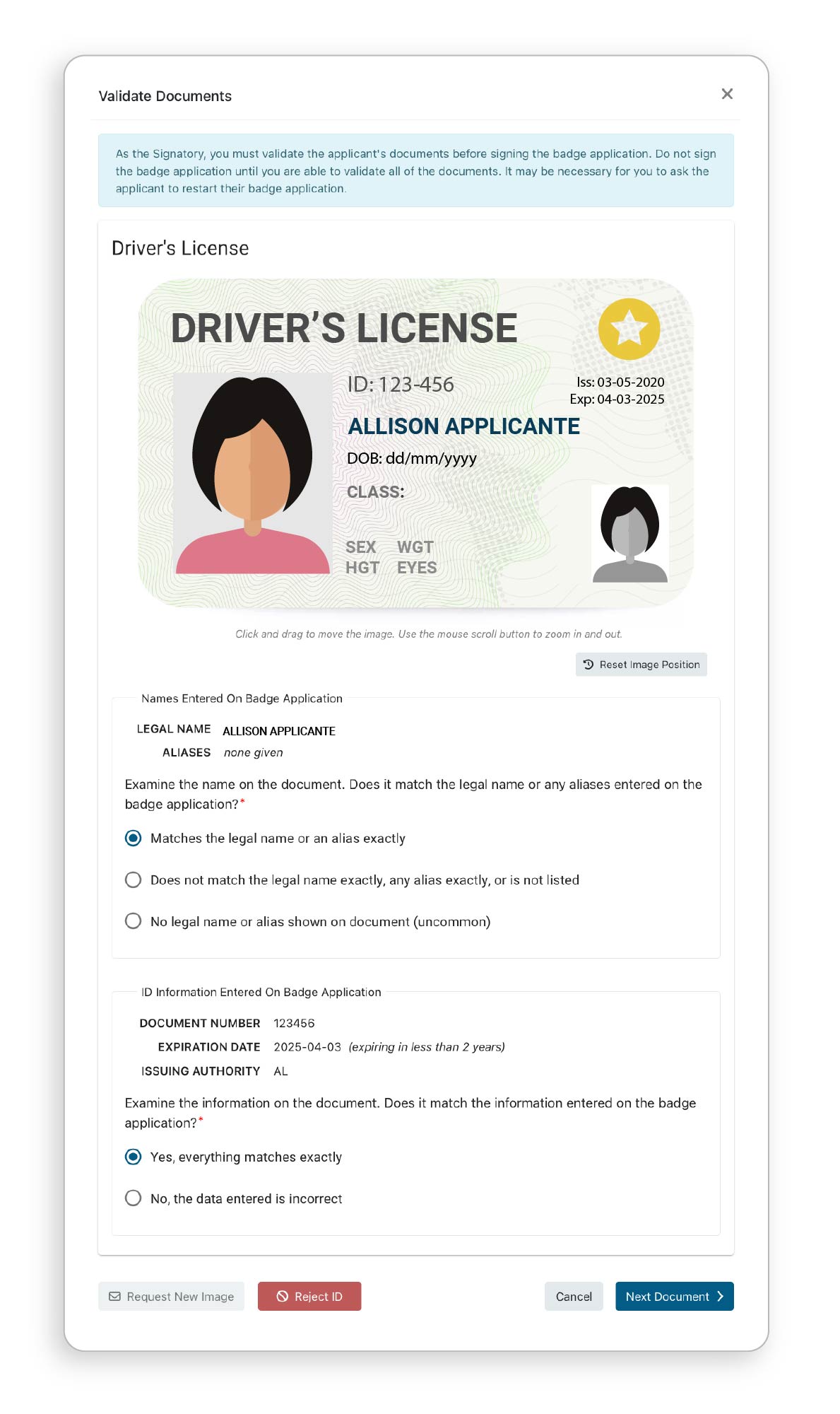 Reject ID: If you note application inconsistencies, select “Reject ID,” requiring the applicant to resubmit their badge application.
